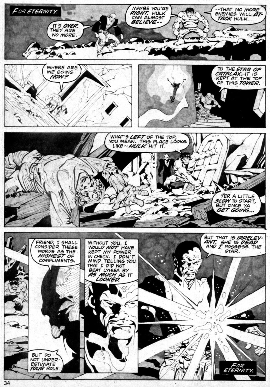 In a distant galaxy, the mage Chen K'an recites an incantation over a mystical pool. Splashing water from the pool forms a puddle that, in turn, casts the reflections of Dr. Banner and Bereet. At that moment, Dr. Banner, Rick Jones and Bereet are in an underground cave in Europe where they've discovered a grand supply of Krylorian equipment that has apparently been abandoned for some time. Dr. Banner and Bereet speculate on the condition and purpose of this equipment when Banner is suddenly zapped away in a ball of energy. As it turns out, Banner has been transported to Chen K'an's castle. Upon seeing Bruce Banner materialize, Chen K'an apologizes then explains that it's not Banner he wants, but rather "--the monster locked within." Chen K'an transforms Banner into his raging alter ego but quickly tires of the Hulk's threats to "smash," so he bestows upon the goliath just enough of Banner's mind to allow for a crude but moderate level of reasoning and craftiness. Chen K'an explains that he wants the Hulk's help in acquiring something called the Star of Catalax. Hulk is reluctant to help until Chen Khan explains that his world was once a magnificent place where its inhabitants spent their energies exploring gifts of the higher mind. The mage recounts how he was once attacked during a meditative spell by demons controlled by his enemy, a sorceress named Lyissa. The attack had, for a time, separated the mage's physical and astral forms. By the time Chen K'an had heeled himself, he found his world left in ruins. His own words condemn it as "--a land of savage barbarians, ravaged by mutations and unholy cannibals." The Hulk agrees to help. Using monstrous leaps, he carries Chen K'an across the land toward Tyroc, Citidel of Terror, where resides Chen K'an's enemy, Lyissa. On the way, the pair is attacked by a horde of winged demons, which are dispatched by The Hulk easily enough. Next, Chen K'an observes a cannibal feeding upon a dead corpse, and the sight disgusts him, reminding him how far his world has fallen. Chen K'an dispatches the cannibal, but it's not long before the pair is attacked again by a larger and more formidable demon. The Hulk engages the creature in battle. Both tumble into a murky body of water; after a period of time, only the Hulk resurfaces. In her own citadel, Lyissa pouts and postures until Chen K'an arrives with the Hulk. The mage demands that Lyissa surrender the Star of Catalax. The sorceress responds by opening a mystical doorway to a fearsome, dark dimension. A horde of vile creatures of every shape and size come pouring through. Fighting side-by-side, the Hulk and Chen K'an battle courageously against overwhelming odds until Chen K'an steps away to directly engage Lyissa in battle. After a trying conflict, Chen K'an manages to banish the demons and their mistress away. Having now gained the Star of Catalax, Chen K'an expresses his gratitude for the Hulk's help. The Hulk asks how the Star will save the mage's fallen world. Chen K'an explains that nothing can save his world; instead, he wants to use the star's power to destroy it. Chen K'an transports the Hulk out of harm's way then proceeds to destroy the planet. The planet endures various stages of physical upheaval before exploding into fragments. The Hulk reappears somewhere in France, speaking out loud in his standard dim & brutish manner again. He claims to feel very sad, only he cannot remember why.The story is a remmorable tale.It's only flaw is first,despite Marvel Fictional history,you wish Chen K'an and the Hulk stay together longer.Their relationship is much like Remo Willian and Chun.Second,the story is too short.More pages might given more more explore the elements,that tell the story.It's written on knowledge,if you know the kind of stuff Jim Starlin write ok,otherwise a new reader might not get it.Also,the Hulk has forget the story,in it's not apart of future Hulk history-future,being the Hulks early 1960's future history.Nobody,but us readers witness the events and thats ashame,since a tale should change the protagonist-in this case the Hulk,but it dosen't he's dum and forgot it,as if it never happenned.Much of the story,like with Captain Marvel,Adam Warlock,Darklon,Dreastar and others revolves about death and suicide,a major element of Mister Starlins own mental thoughts. cover art by Jim Starlin (pencils) and Daina (inks); Great Moments in Hulk History article by Doug Moench, art by Ed Hannigan; Hulk Prologue, script by Doug Moench, art by Jack Kirby; The Other Side of Night, script by Jim Starlin (plot) and John Warner (script), Pencils by Jim Starlin, Inks by Alex Nino; Gallery of Villains Hulk article by David Kraft, art by Keith Giffen; and Return from Oblivion, Script by John Warner, Pencils by Val Mayerik, Inks by Sonny Trinidad. 68 pgs. Cover price $1.00.